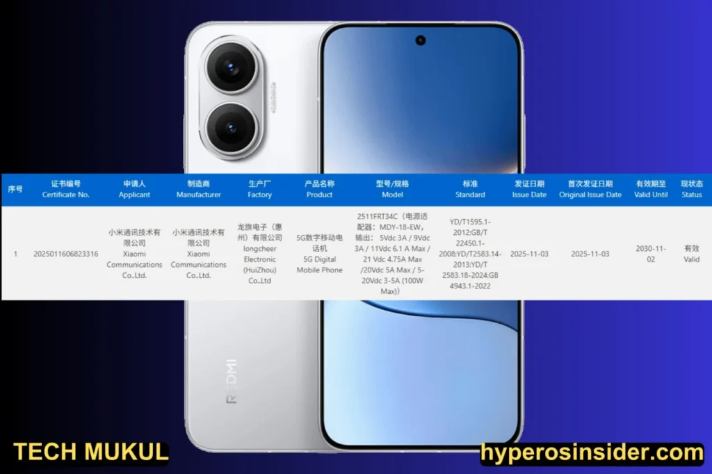 REDMI Turbo 5 is officially certified as you can see in the above image, 2511FRT34C is the model number which shows the launch will be in November, but we can see it in the month of December with latest details, like 100W and 9000mAh Battery support. Xiaomi s trying to make Turbo Series more powerful, if they launch it with 9000mAh so they have to bring the Pro model with more power.