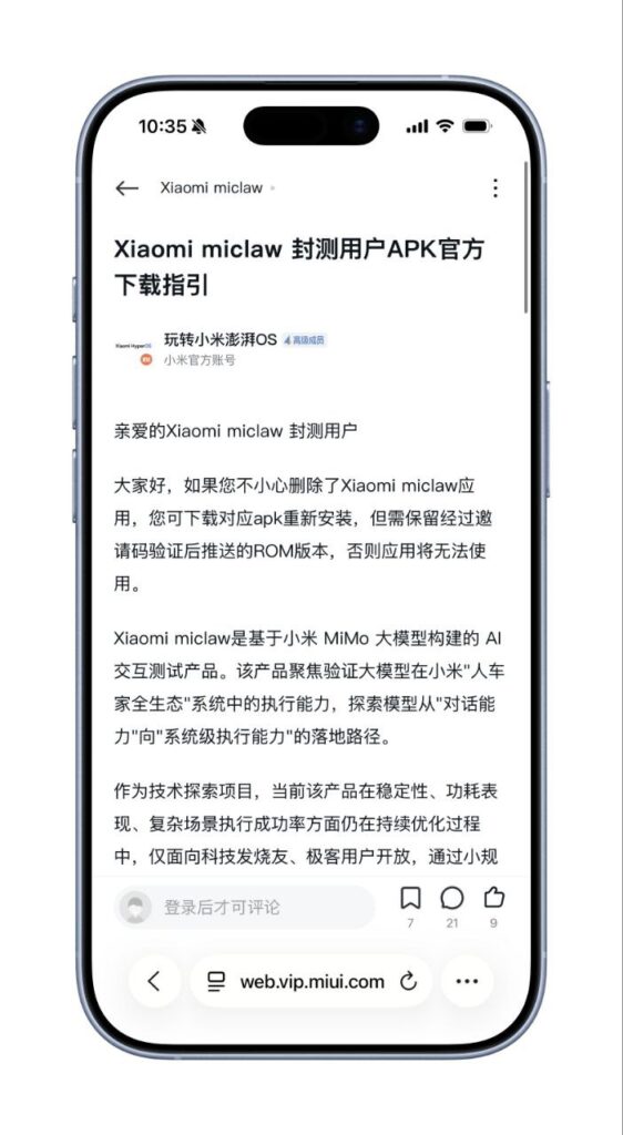 Xiaomi Miclaw is an AI interaction testing product based on Xiaomi’s MiMo large-scale model. The product focuses on validating the large-scale model’s execution capabilities in Xiaomi’s “full ecosystem of people, cars, and homes” system, and exploring the path of translating the model’s “dialogue capabilities” into “system-level execution capabilities“.